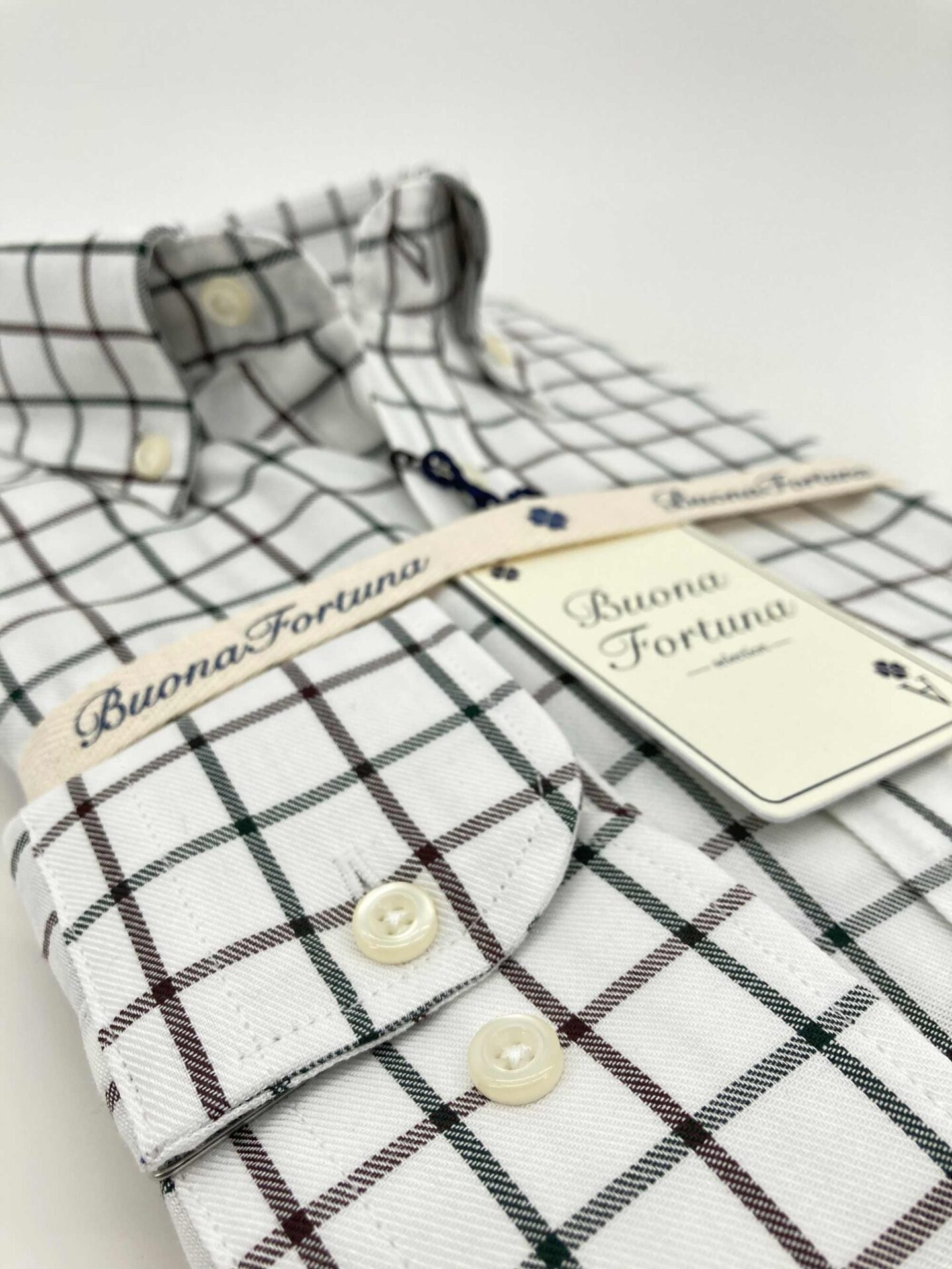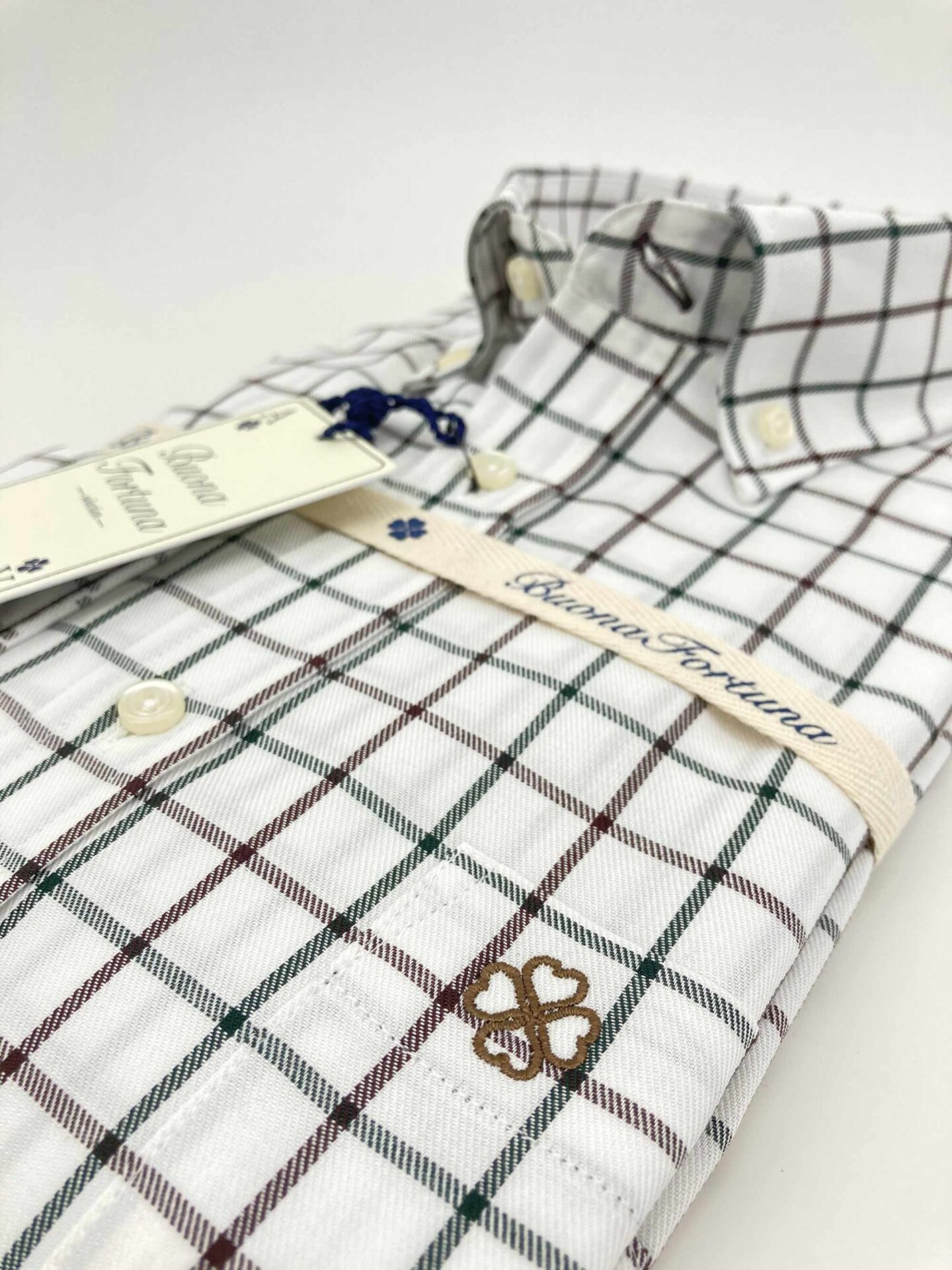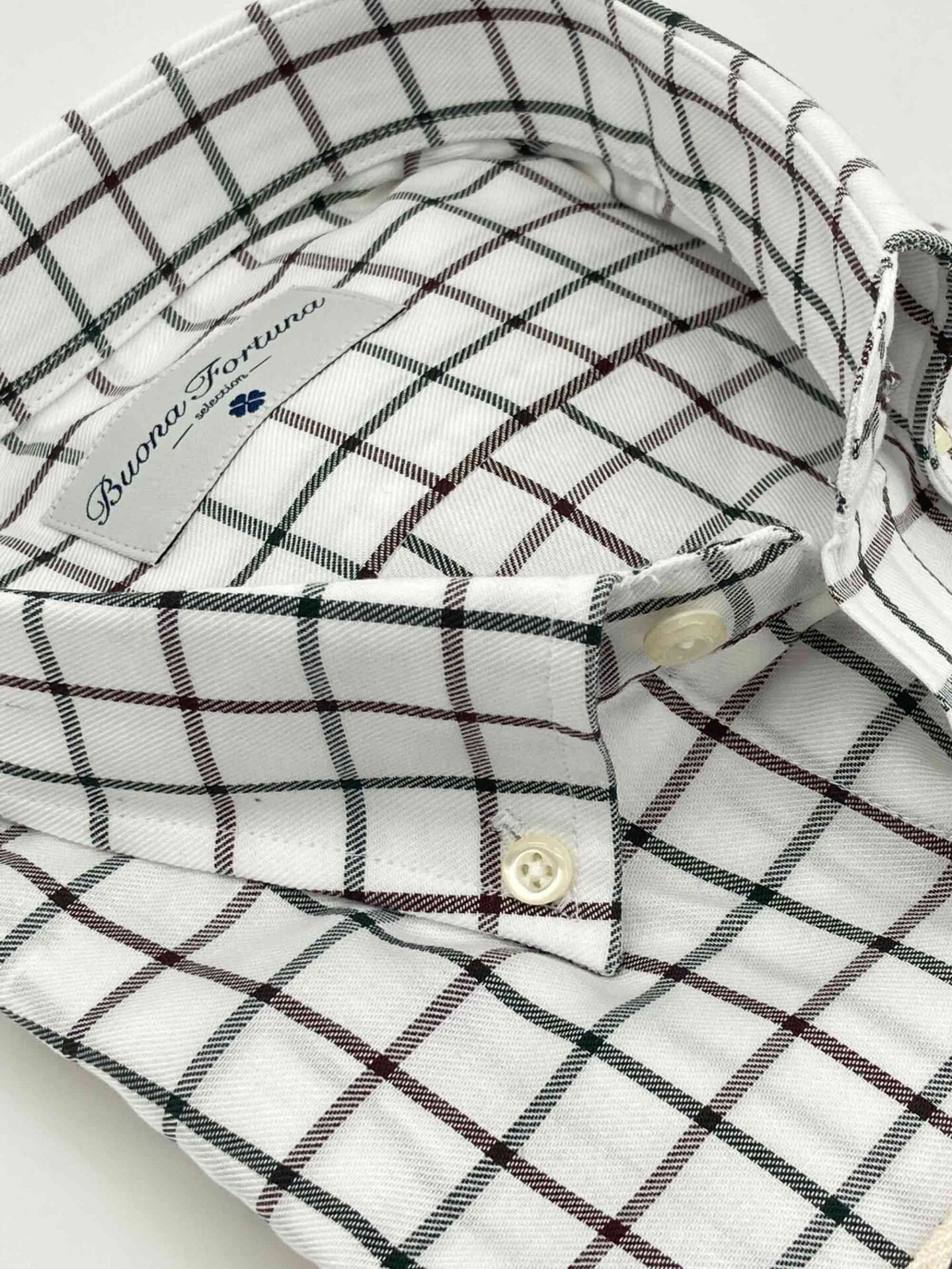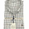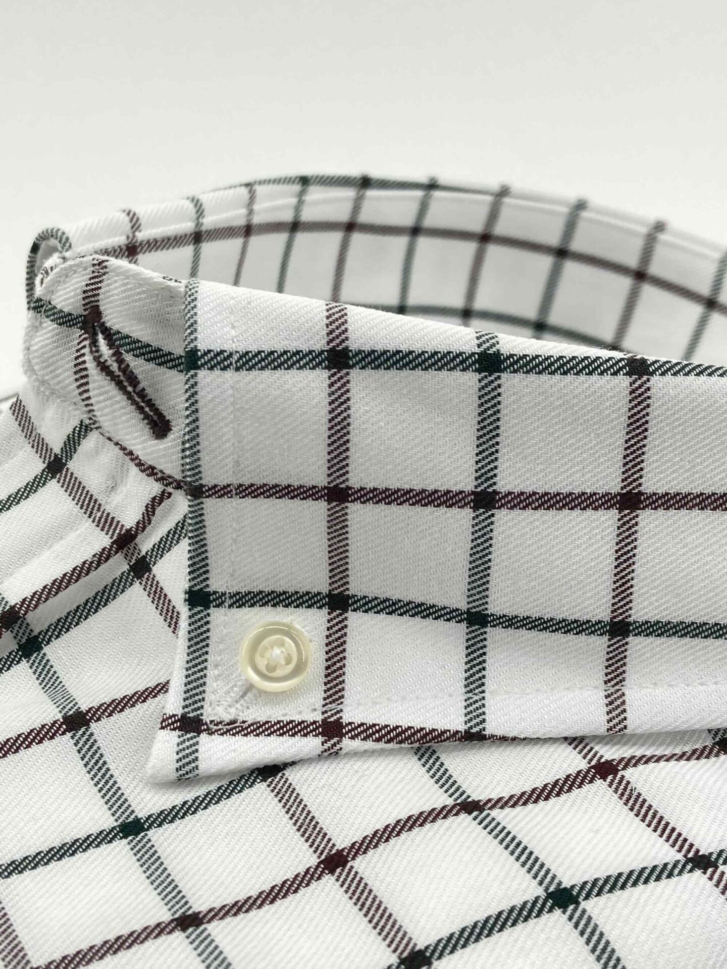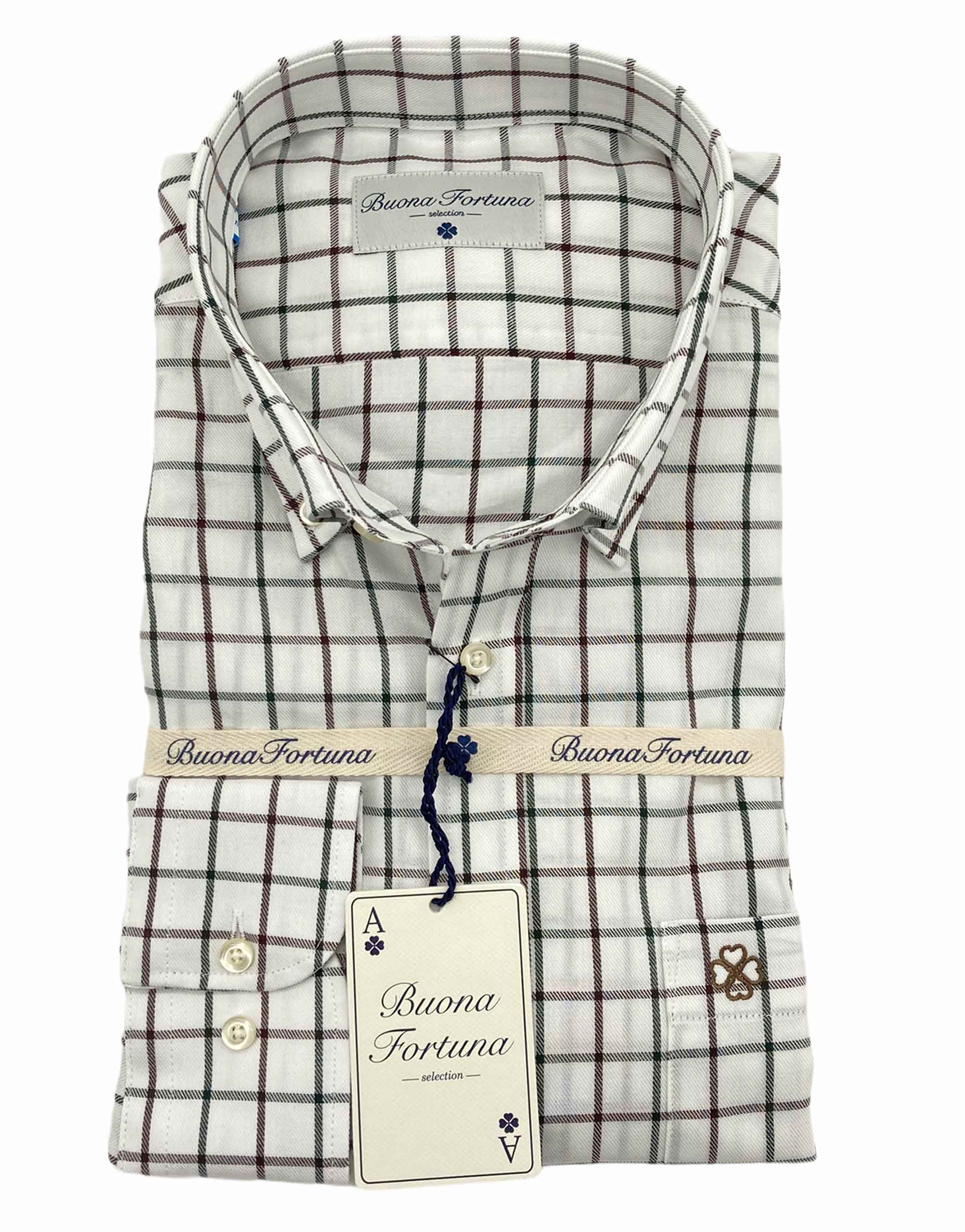 Camisa cuadros verdes y marrones, fondo crudo, confeccionada en tejido de sarga, tacto caliente.