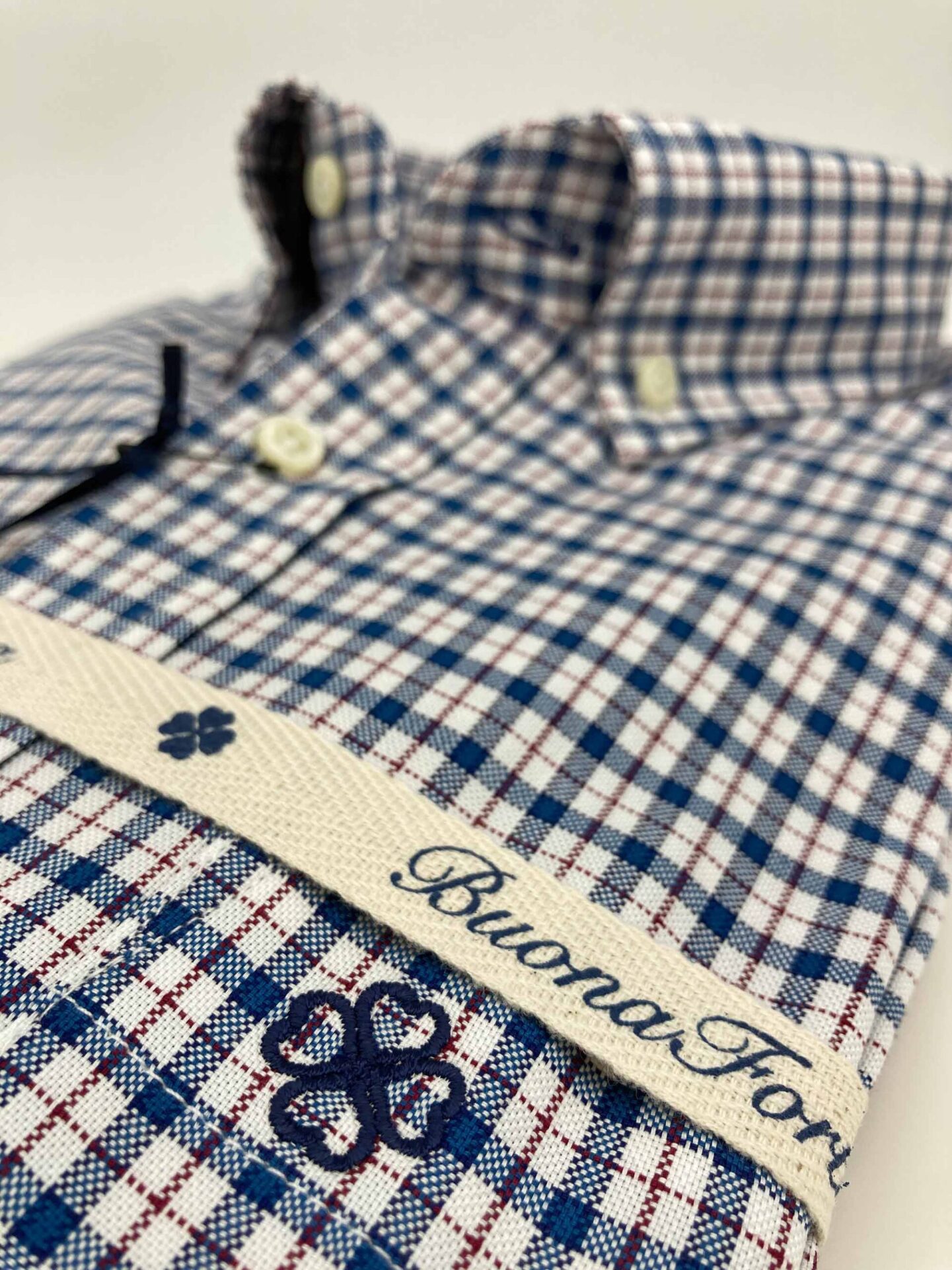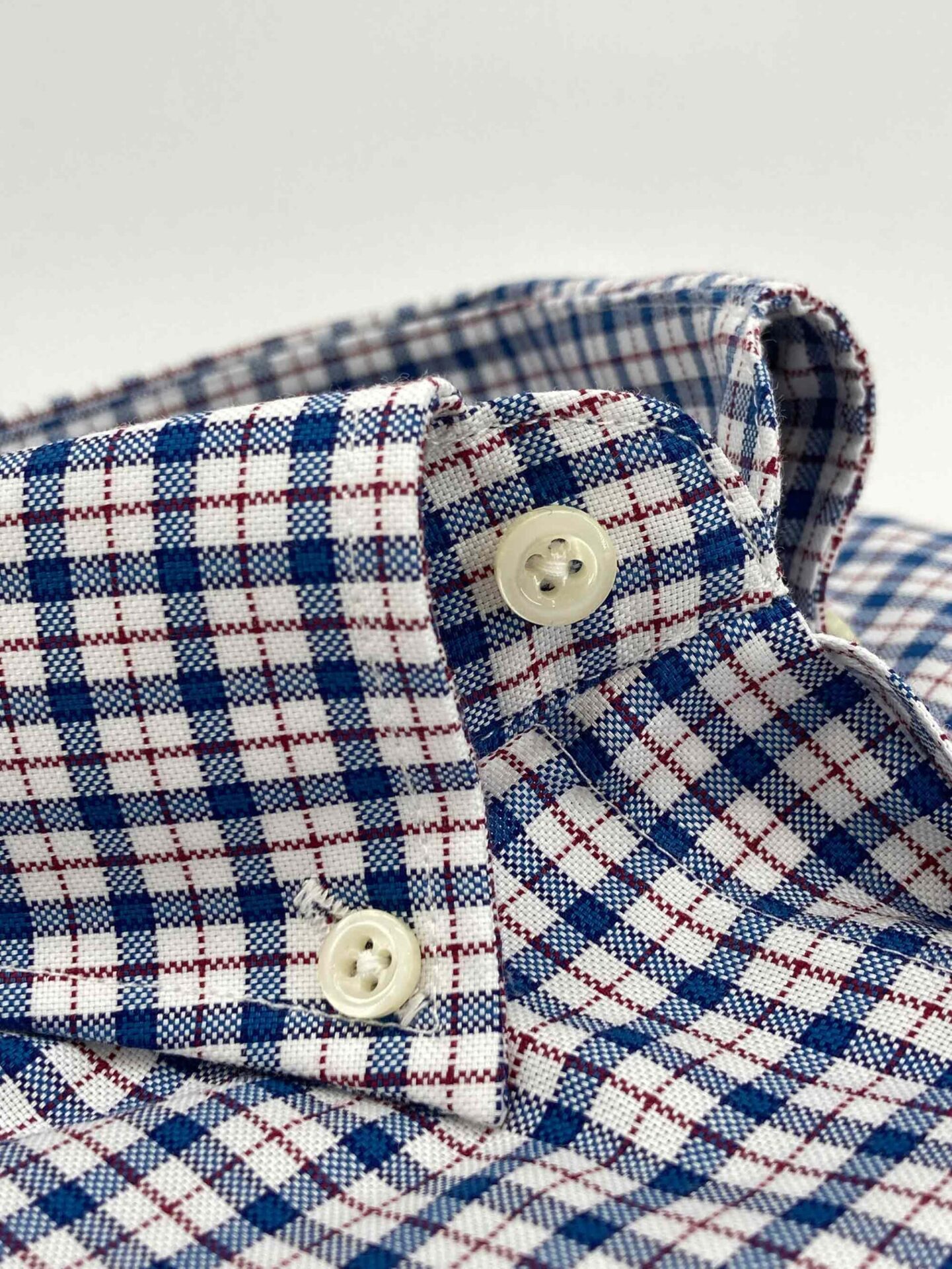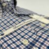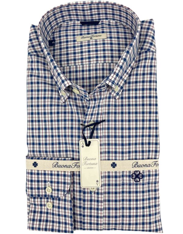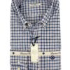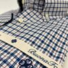 Camisa de cuadros, tejido con estructura tipo oxford, de colores azul y blanco con perfil en rojo rubí, con un acabado lavado que le confiere una calidez y suavidad ideal para el otoño.