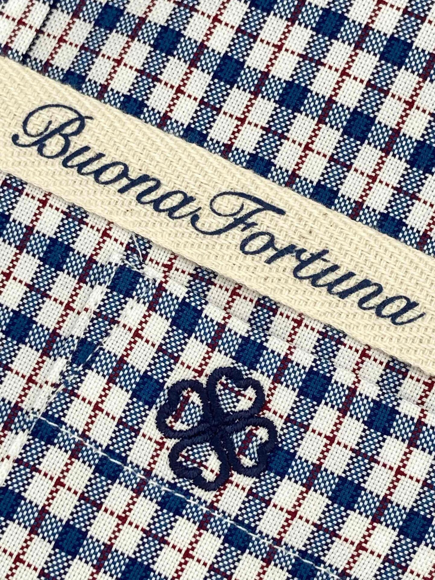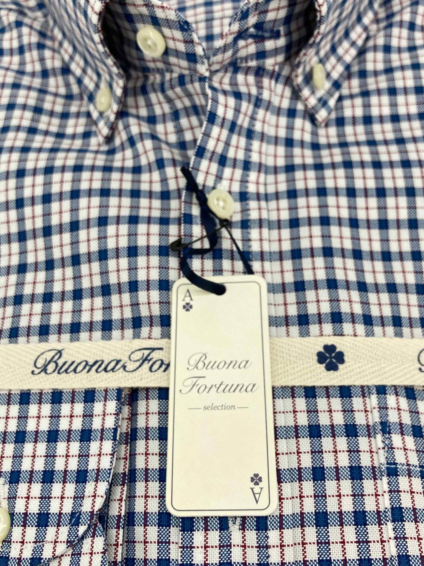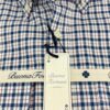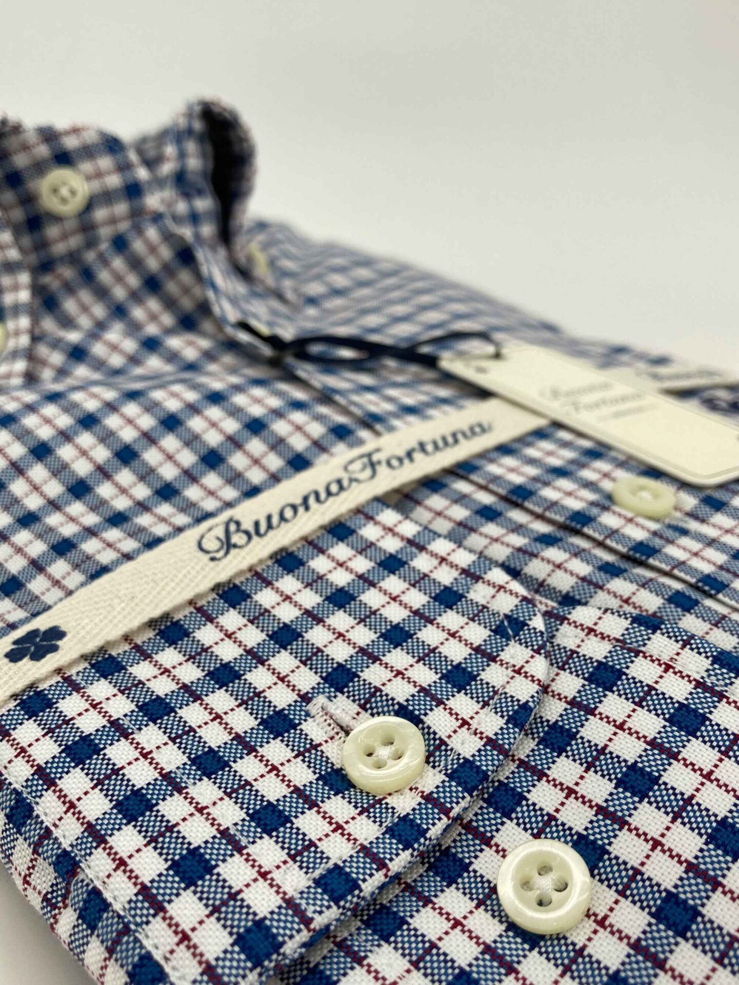 Camisa de cuadros, tejido con estructura tipo oxford, de colores azul y blanco con perfil en rojo rubí, con un acabado lavado que le confiere una calidez y suavidad ideal para el otoño.