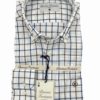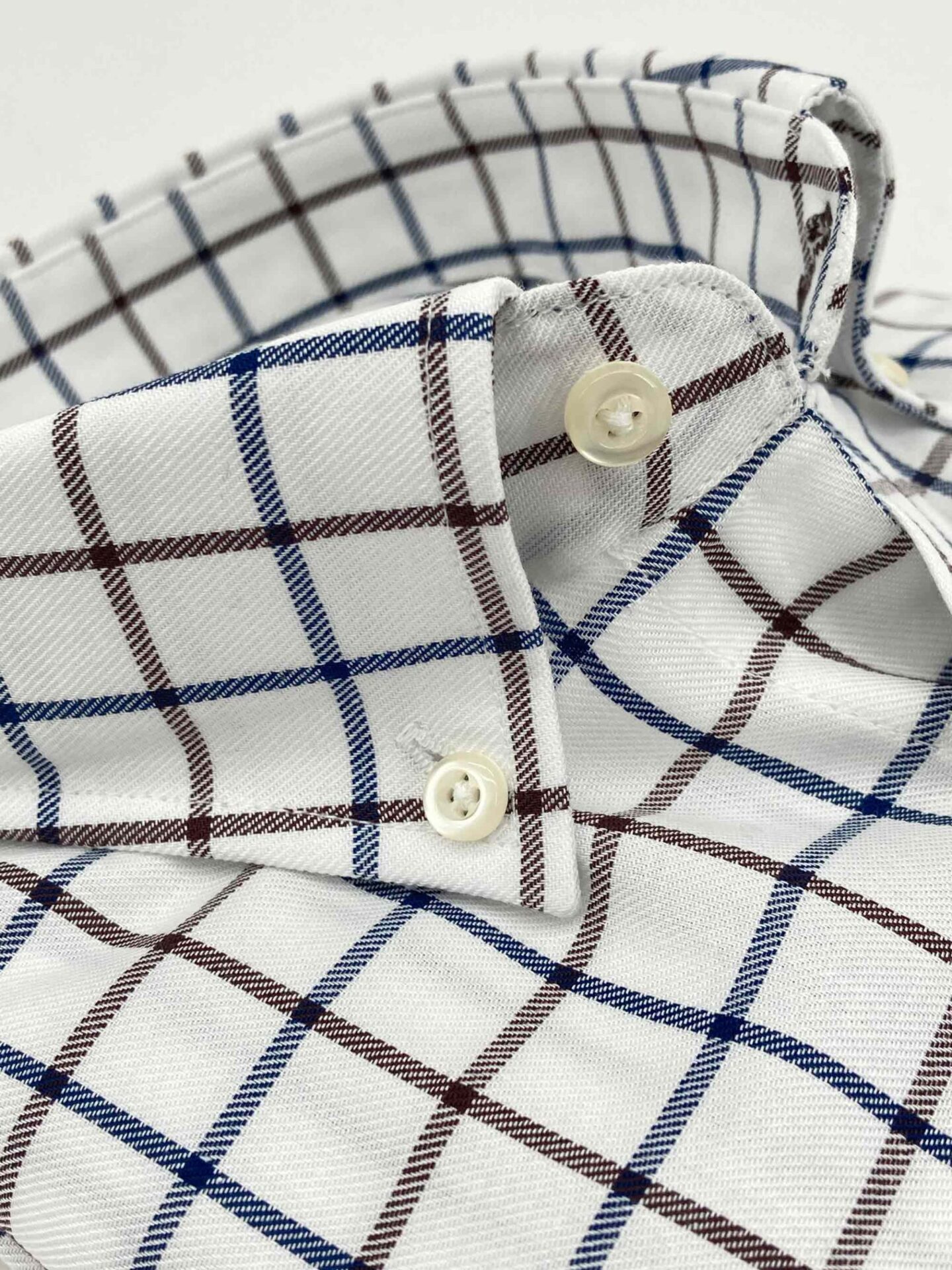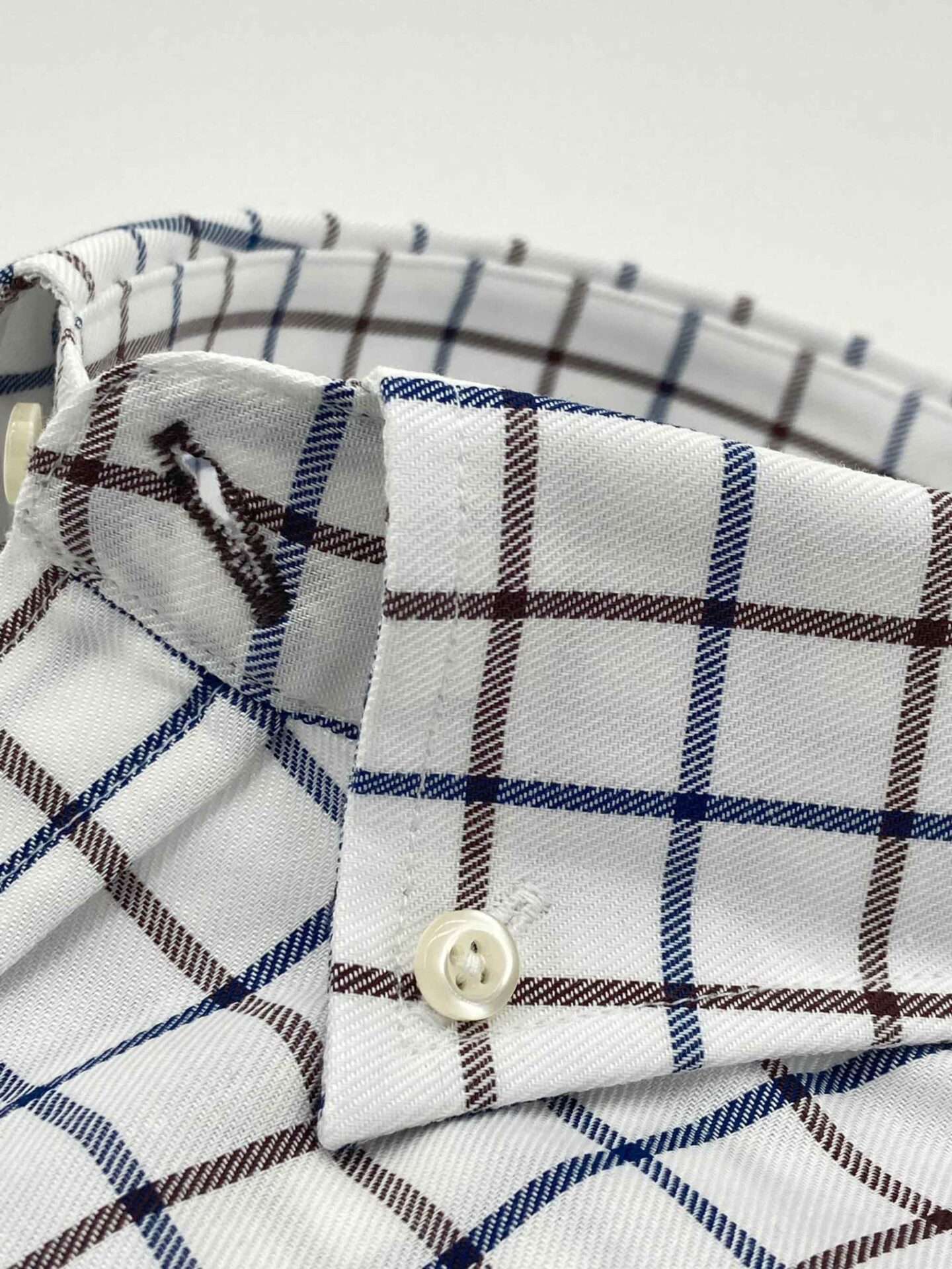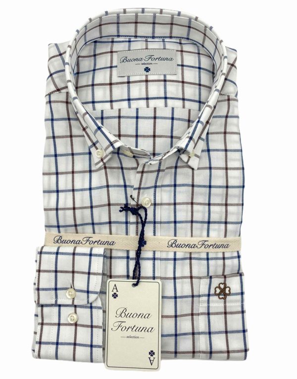 Camisa cuadros azules y marrones, fondo crudo, confeccionada en tejido de sarga, tacto caliente.