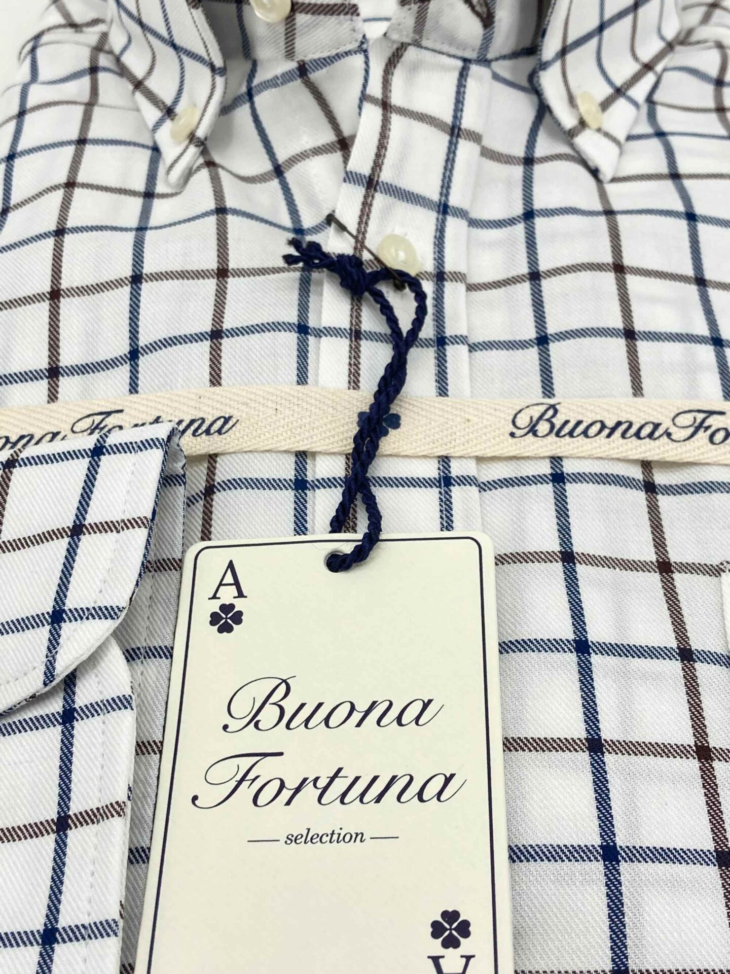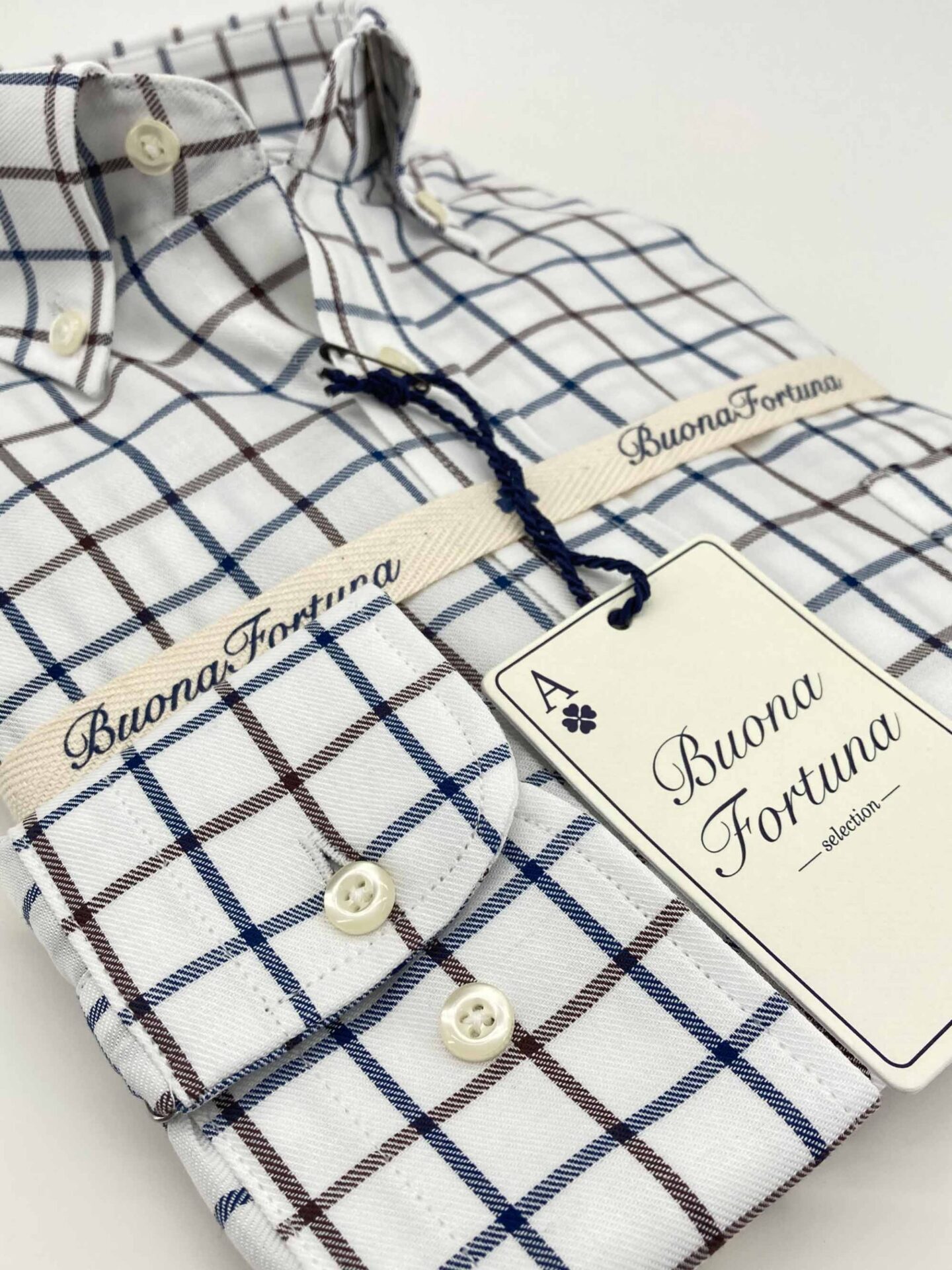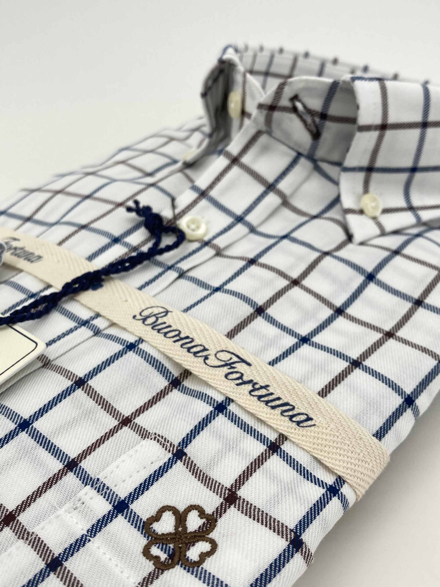 Camisa cuadros azules y marrones, fondo crudo, confeccionada en tejido de sarga, tacto caliente.