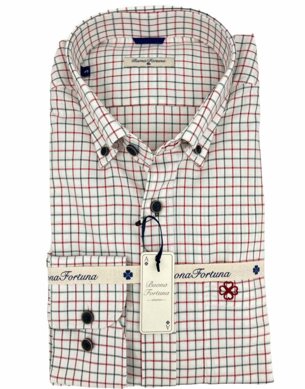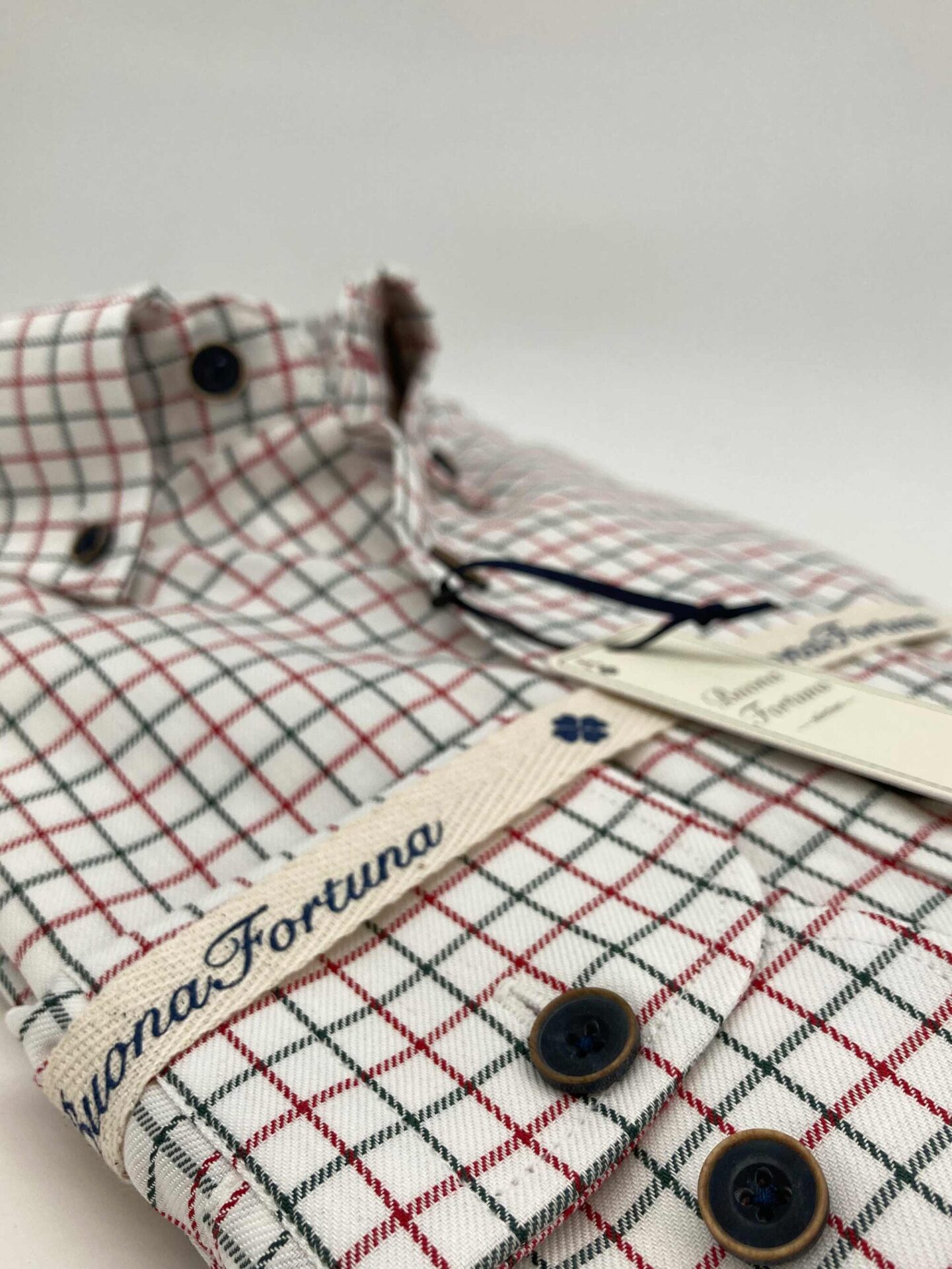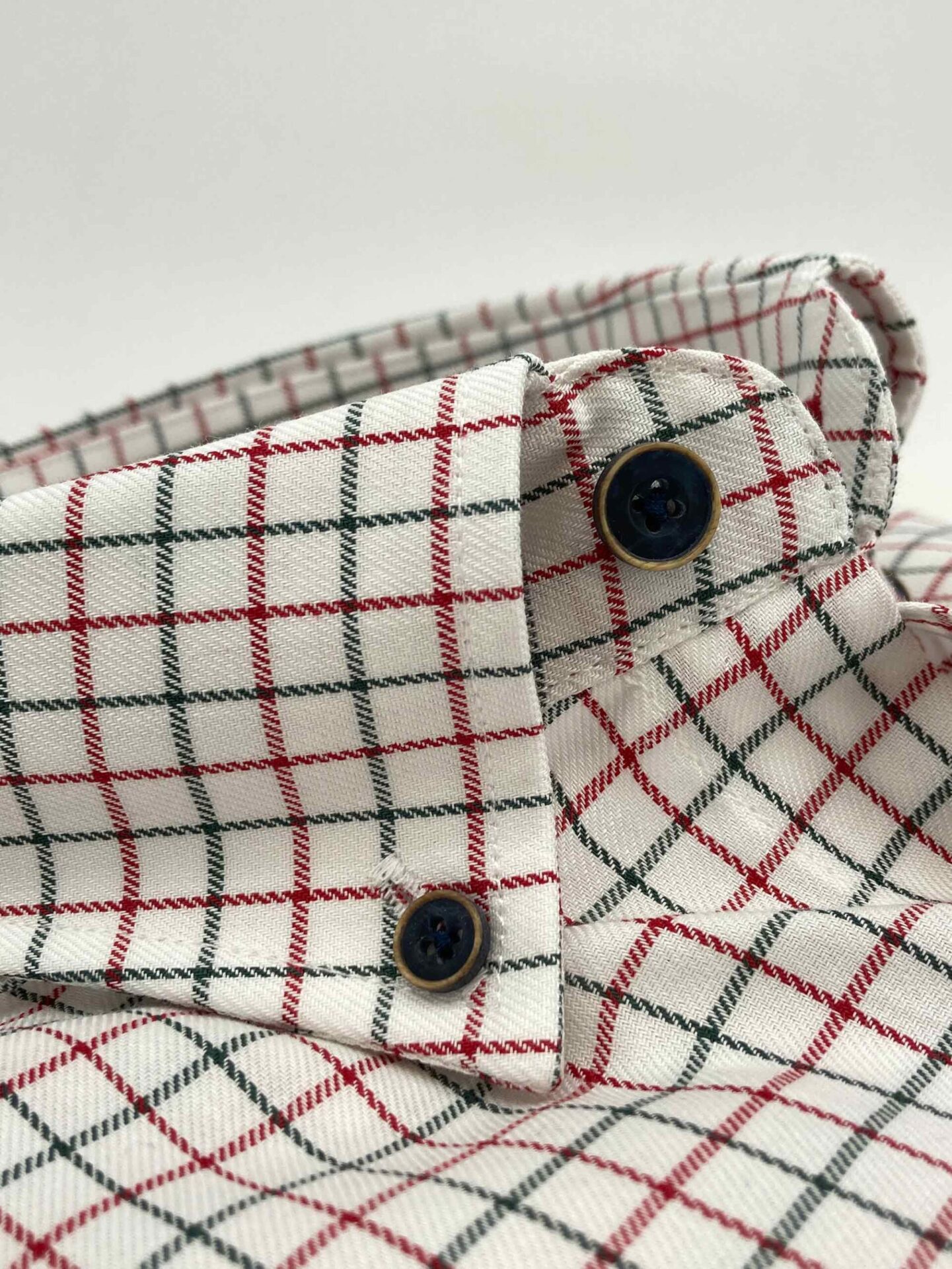 Camisa de cuadros harrys, un tipo de cuadro muy propio de invierno, un clásico en tendencia, combinando colores rojo rubí y verde sobre fondo crudo, tejido tipo Vielha, con un acabado lavado que le confiere una calidez y suavidad ideal para el otoño.