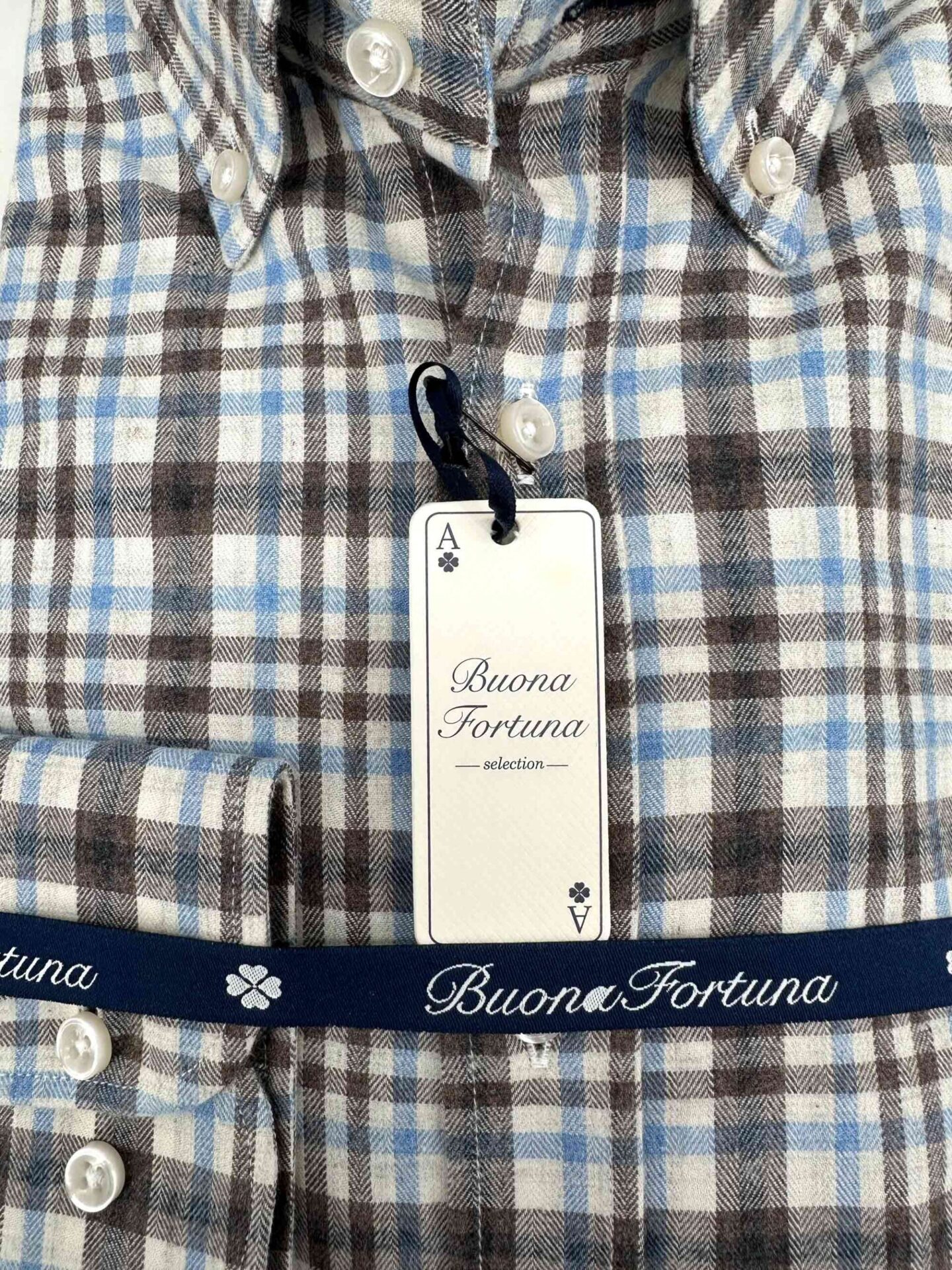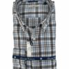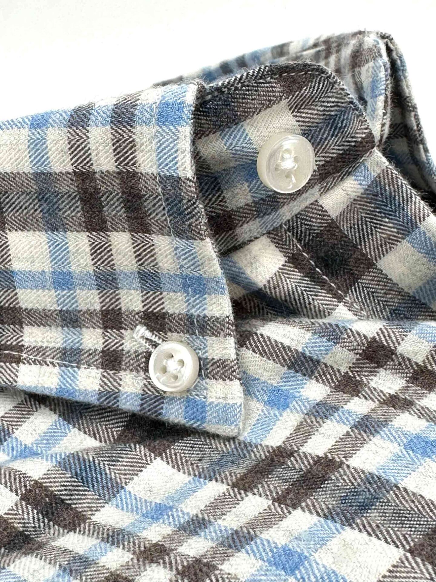 Camisa de cuadros marrones, azul celeste y crudo, tejido cálido de invierno, para vestir un look sport y cómodo, ideal para combinar con prendas azul marino, gama de marrones o de colores claros, confeccionada en un tejido de vielha espigado, con un acabado suavizado.