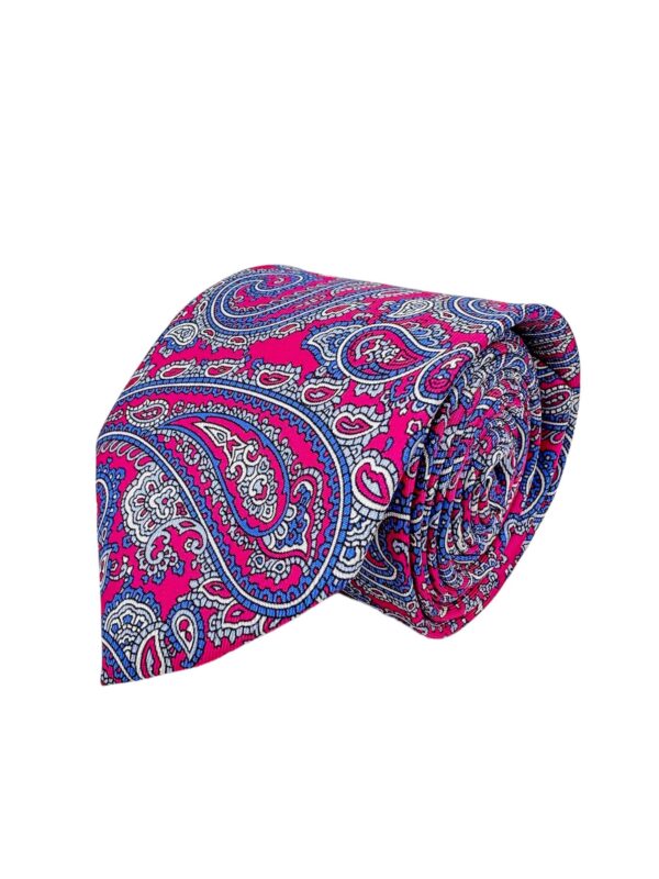 Confeccionada en Italia en tejido 100% seda de alta calidad, esta corbata destaca por su suavidad al tacto, su ligereza y su brillo natural. La seda realza la intensidad del color fresa y la definición de los motivos azules y blancos, además de garantizar resistencia y durabilidad para un uso continuado. Cada pieza está cuidadosamente acabada a mano, reflejando la tradición artesanal italiana y la atención minuciosa a cada detalle del proceso de confección.