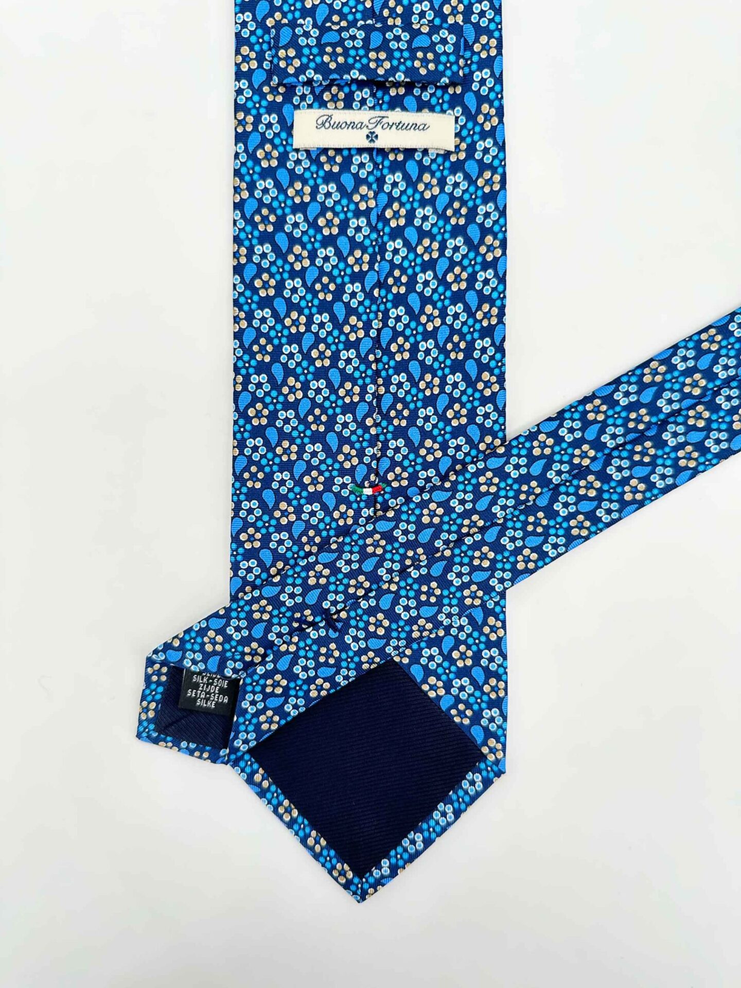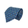 Confeccionada en Italia en tejido 100% seda de alta calidad, esta corbata destaca por su suavidad al tacto, su ligereza y su brillo natural. La seda realza la intensidad del color azul y la definición de los motivos, además de garantizar resistencia y durabilidad para un uso continuado. Cada pieza está cuidadosamente acabada a mano, reflejando la tradición artesanal italiana y el cuidado minucioso en cada detalle del proceso de confección.