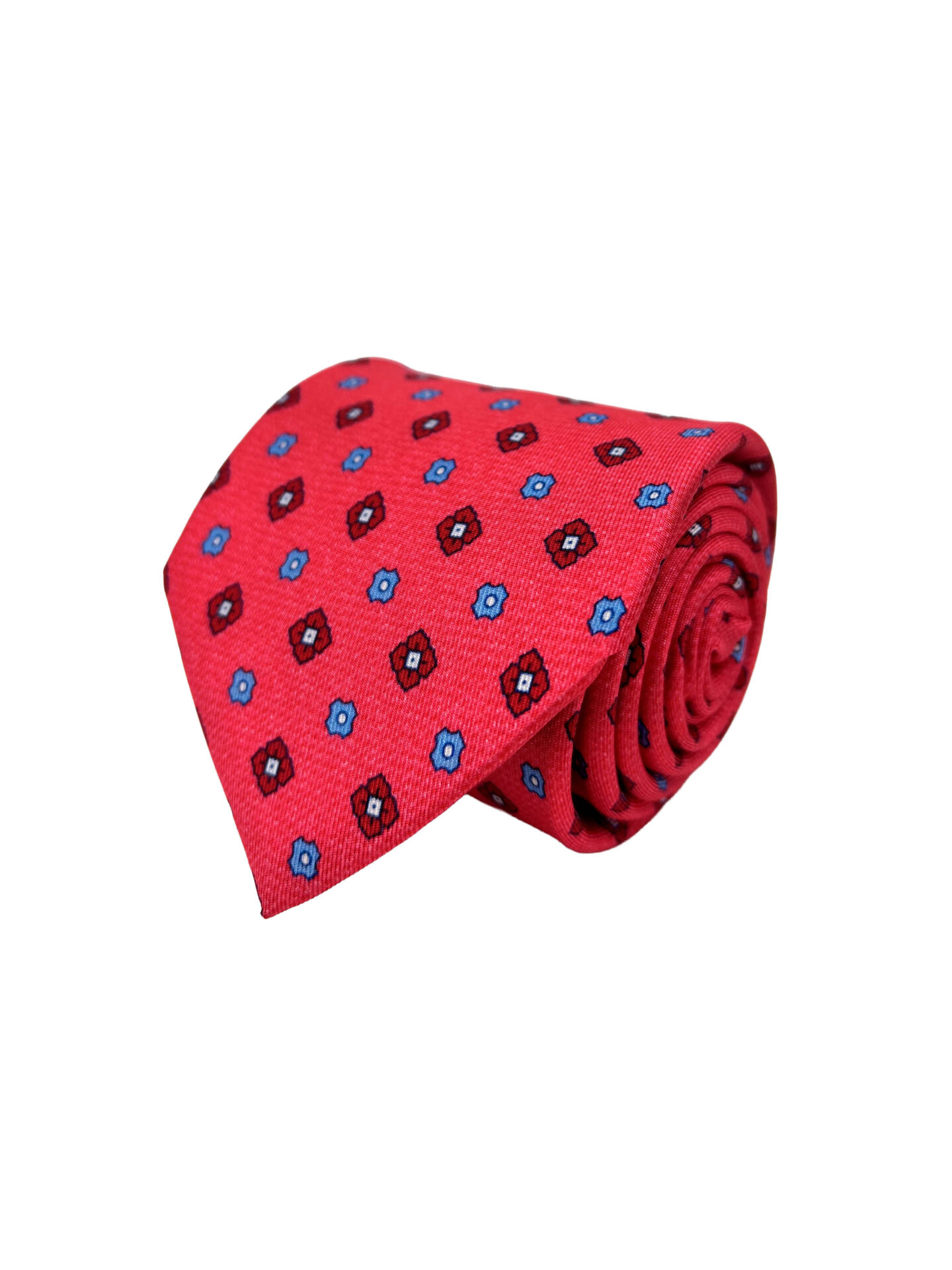 Corbata Twill estampada fondo fresa con motivos florales cobraderos en rojo y azul celeste.