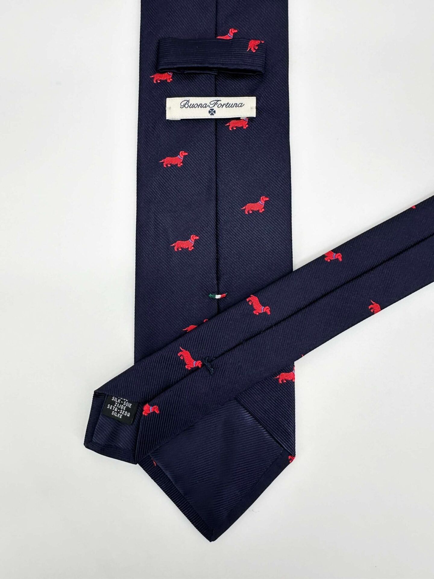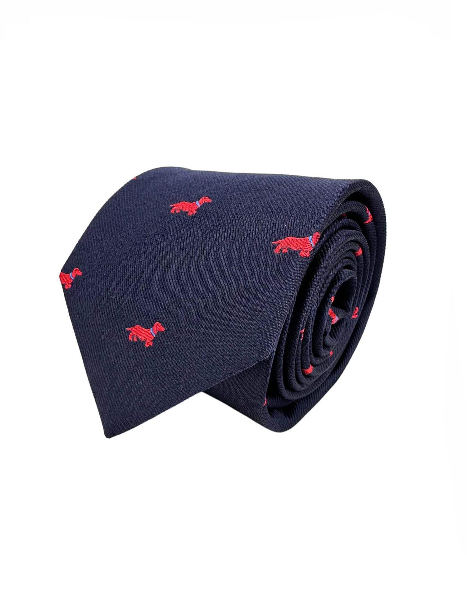 Corbata tejida marino con diseño de perros teckel en rojo, combinandola con camisa blanca o celeste queda  perfecta, para  traje y chaqué, muy ceremoniosa.
