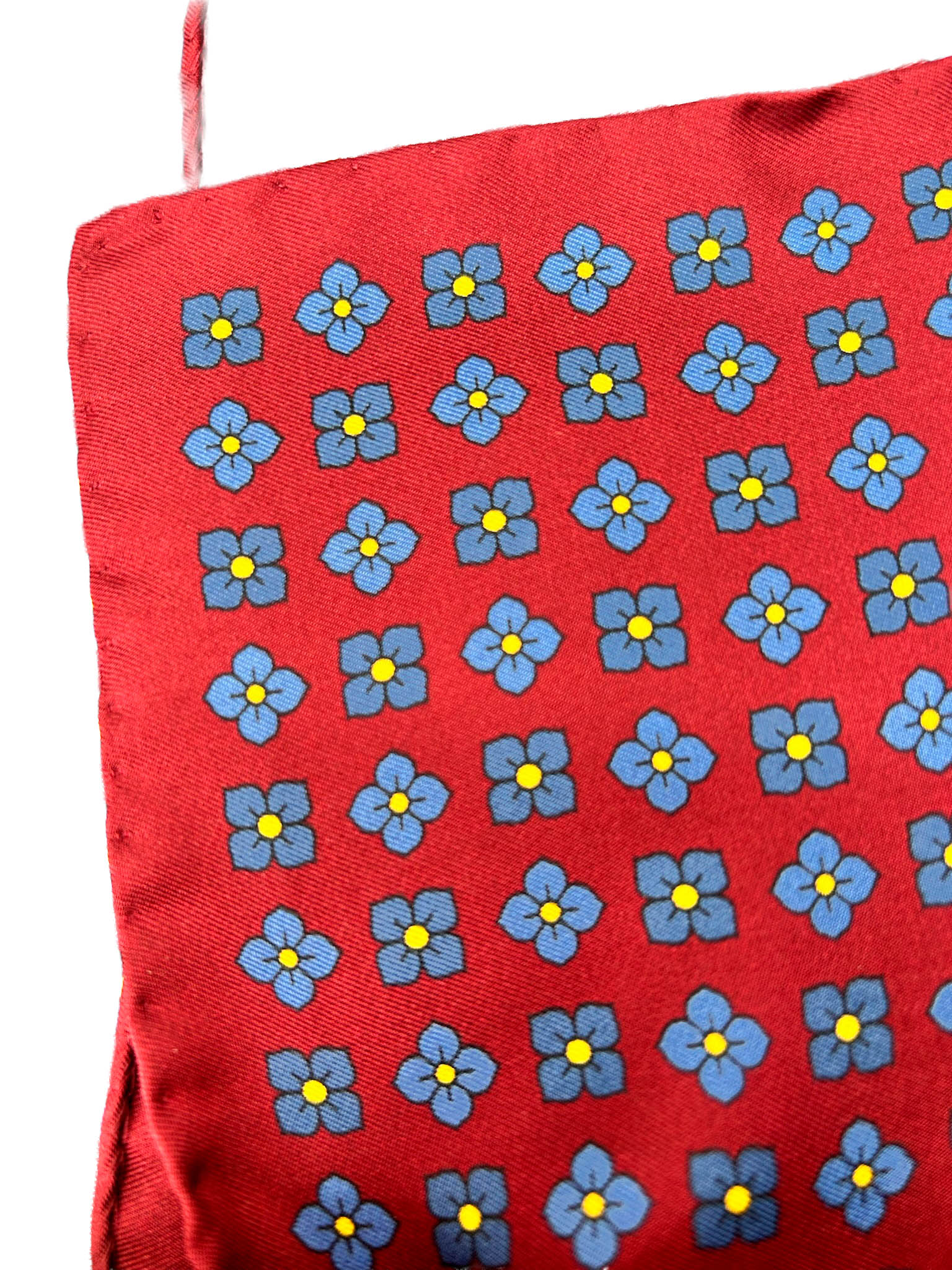 Pañuelo de bolsillo burdeos con diseño de flores azules.
