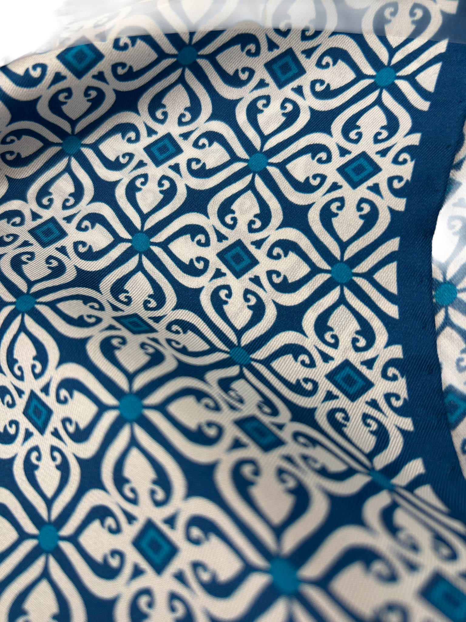 Pañuelo de bolsillo con patrón geométrico entrelazado en azul y blanco.