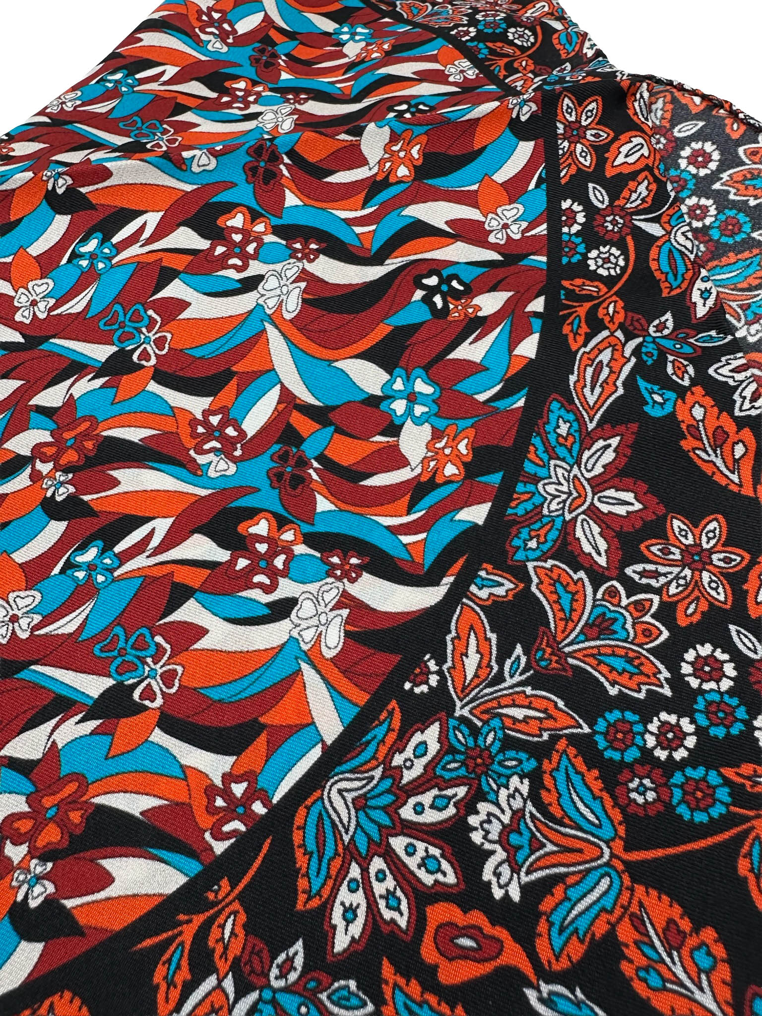 Pañuelo de bolsillo con estampado floral y negros, naranjas y turquesas.